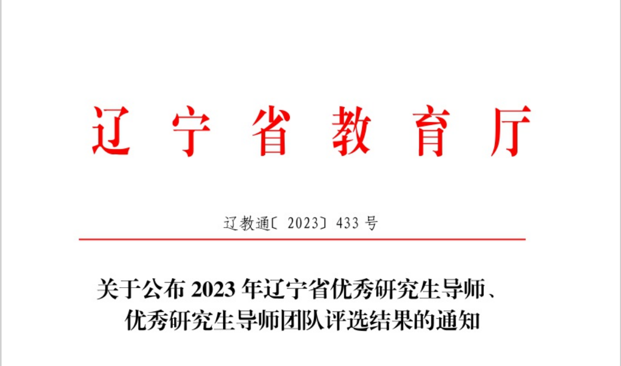 近日,辽宁省教育厅公布了《2023年辽宁省优秀研究生导师、优秀研究生导师团队评选结果的通知》(辽教通〔2023〕433号)。我校雷海新、李韶、田晓峰、王琪等四位研究生导师获辽宁省优秀研究生导师;党委副书记、校长赵杰教授牵头的导师团队获辽宁省优秀研究生导师团队,我校优秀研究生导师和优秀研究生导师团队获评总数处于省属高校前列。
