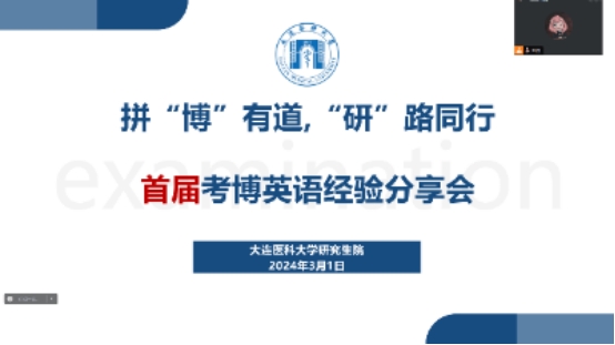 3月1日,由研究生院主办,校研究生会承办的拼“博”有道,“研”路同行首届考博英语经验分享会以线上会议的形式顺利举行。本次分享会旨在帮助备考我校全日制和在职博士研究生考生进一步明晰考博目标,扫除英语考试复习中的障碍,合理调节备考情绪,科学调整考前冲刺方案,更顺利地考入理想院校。