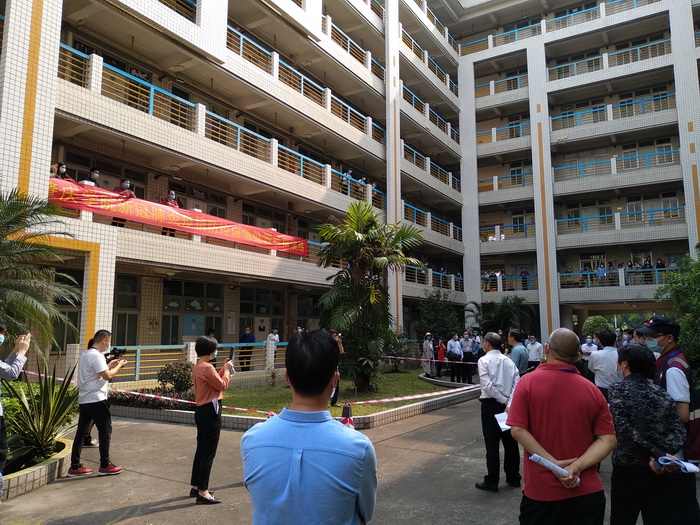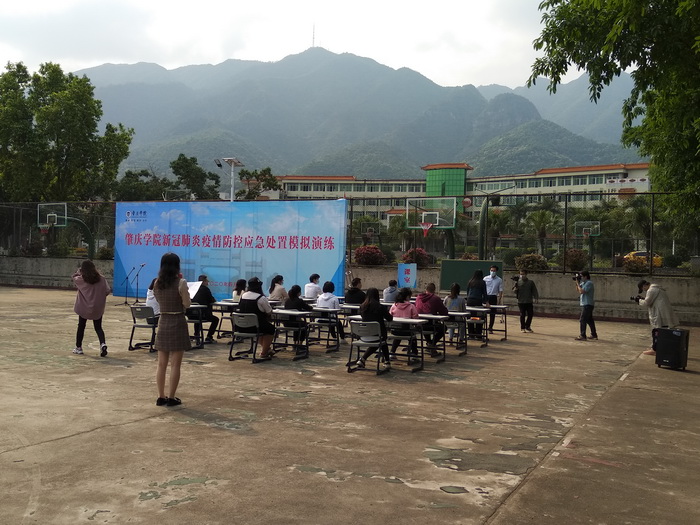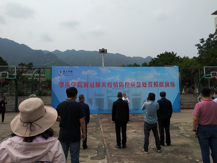 本网讯:4月17日下午3时,学校举行新冠肺炎疫情防控应急处置模拟演练。模拟学生返校进入校门、学生宿舍和上课课室三种情境下,出现发热学生,进行应急处置模拟演练。肇庆市疾控专家、学校领导、防控专班和职能部门、二级学院院长、书记、副院长、副书记、办公室主任、辅导员等300多人参加观看演练。